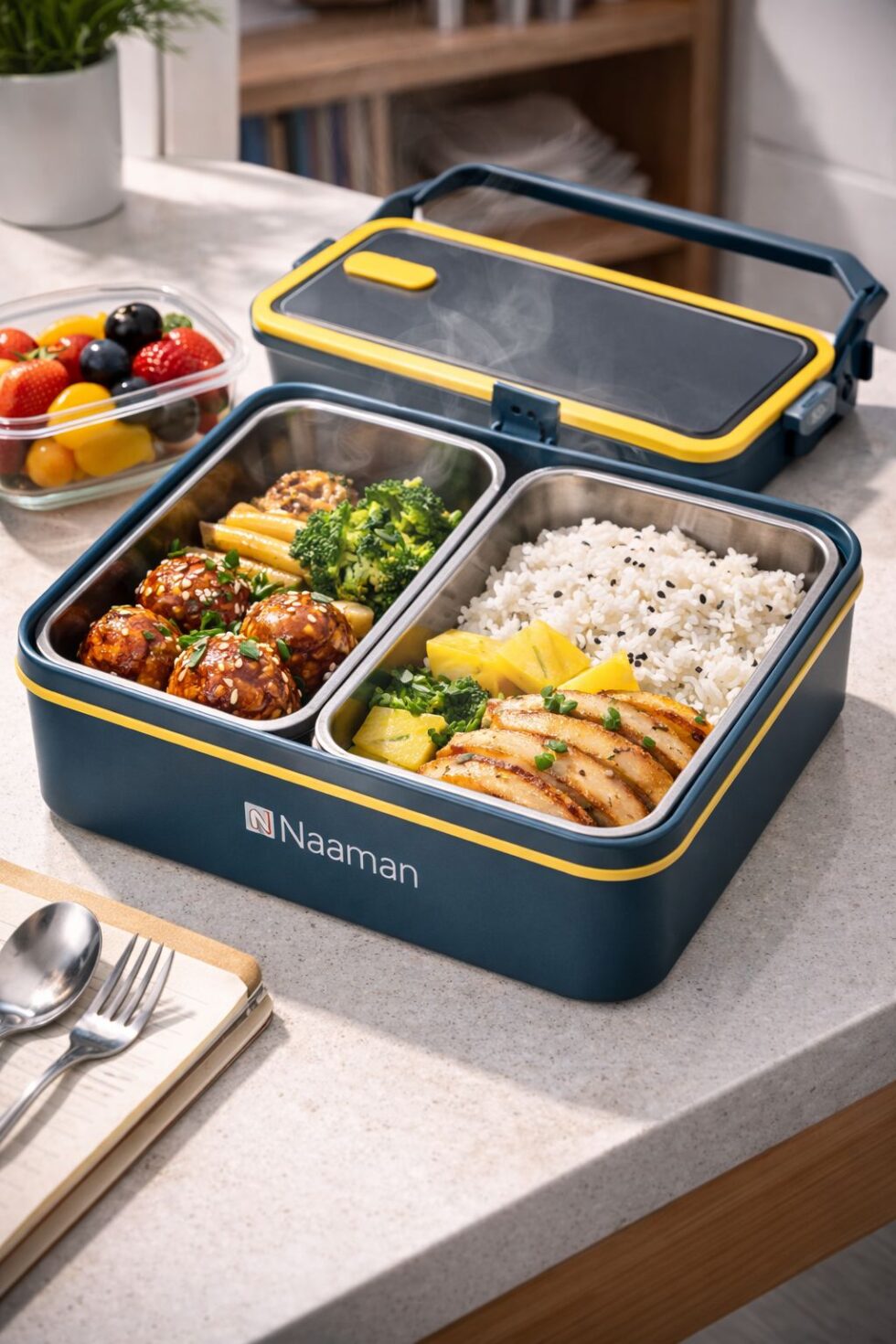 استمتع بالمزيج المثالي بين الأناقة وسهولة الاستخدام مع صندوق الغداء الفاخر من Naaman. تم تصميم نظام إعداد الوجبات متعدد الاستخدامات هذا للطلاب والمحترفين وعشاق اللياقة البدنية، مما يضمن بقاء طعامك طازجًا ومنظمًا وجاهزًا للاستمتاع به أينما كنت.