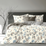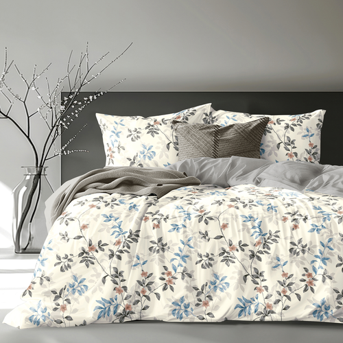 أضف لمسة من الرقي إلى غرفة نومك مع طقم غطاء اللحاف “دوريس” الهادئ والجميل. يُعد هذا الطقم جزءًا من مجموعة “سوفتي”، ويتميز بنقشة أوراق متدلية رقيقة وأزهار متسلقة بألوان الأزرق الرمادي الفاتح والمرجاني الناعم على خلفية كريمية فاتحة، مع لمسات رمادية عصرية لإطلالة متوازنة وعصرية.