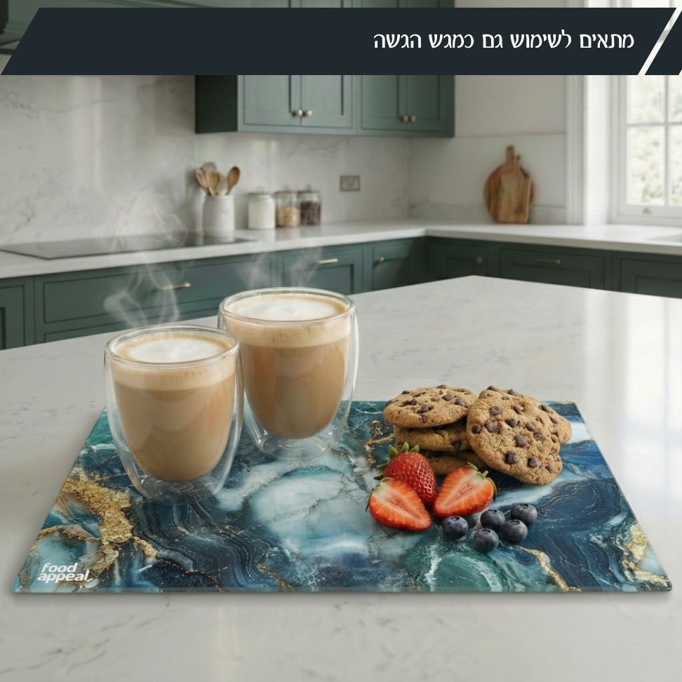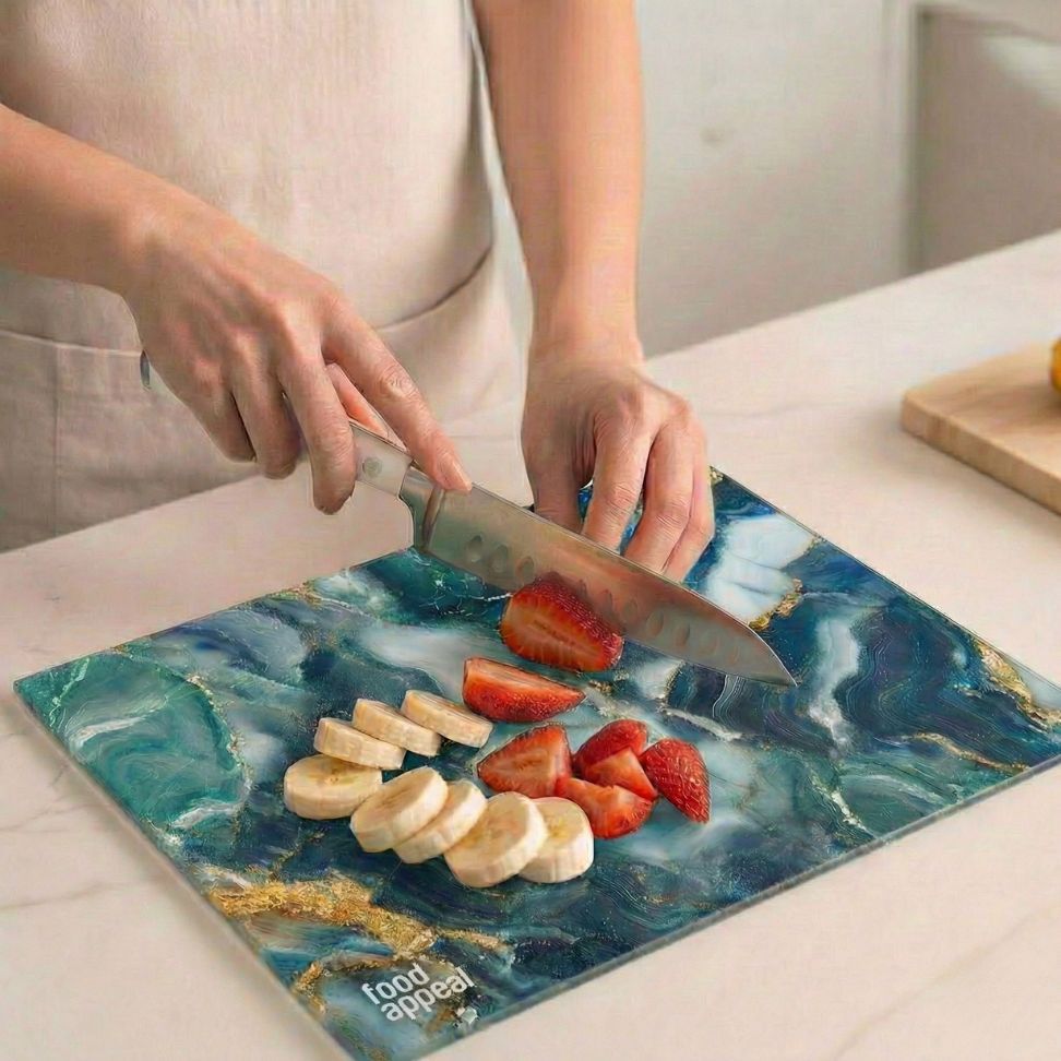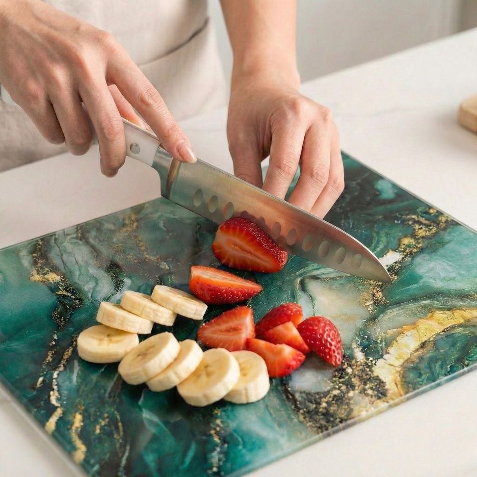 لوح تقطيع زجاجي مصمم: مزيج مثالي بين الفن وأدوات المطبخ. لوحنا الجديد لا يبدو كتحفة فنية على سطح العمل فحسب، بل إنه مصمم أيضاً ليتحمل الاستخدام الشاق.