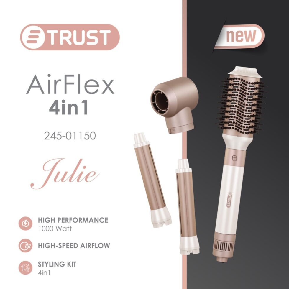 جففي وصففي شعرك بسهولة مع TRUST Julie AirFlex 4 في 1. يتميز هذا الجهاز بقوة 1000 واط وتدفق هواء عالي السرعة لتجفيف سريع ونتائج مثالية.