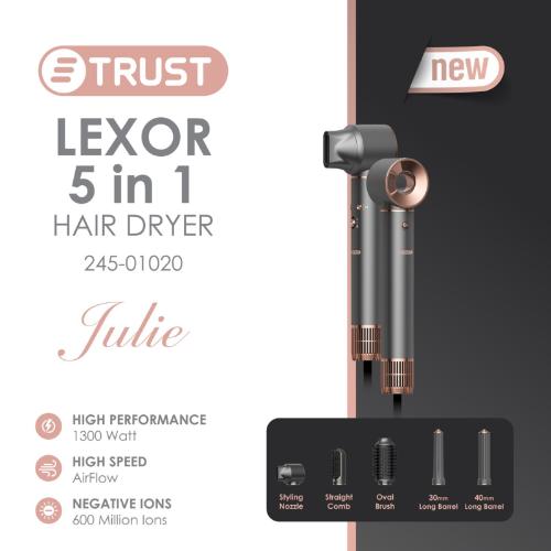 התנסו בעיצוב ברמה מקצועית עם מייבש שיער Trust Lexor 5-in-1 “ג’ולי” (דגם 245-01020), כלי יופי רב-תכליתי שנועד לייבוש, לסלסל ולהחליק את כל סוגי השיער. מופעל על ידי מנוע 1300 וואט בעל ביצועים גבוהים וזרימת אוויר במהירות גבוהה, מייבש זה משתמש במערכת יונית מתקדמת המשחררת 600 מיליון יונים שליליים כדי לחסל קרזול ולהגביר את הברק. סט מקיף זה מגיע עם חמישה אביזרים ניתנים להחלפה: פיית עיצוב מדויקת, מסרק ישר, מברשת אובלית לנפח, וחביות באורך 30 מ”מ ו-40 מ”מ עבור תלתלים ללא מאמץ. בין אם אתם מחפשים מראה ישר וחלק או גלים קופצניים, מעצב הכל-באחד הזה מספק יעילות במהירות גבוהה ותוצאות באיכות סלון באריזה אחת אלגנטית של פחם וזהב ורדרד.